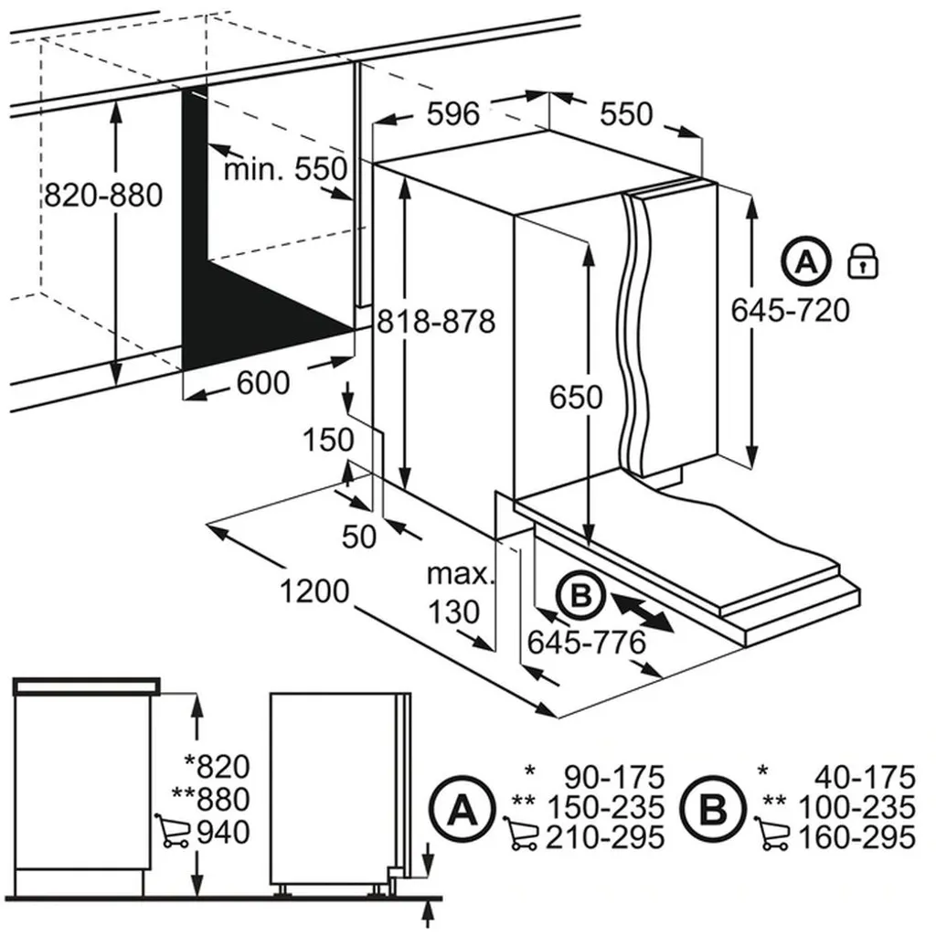 Einbaumaße H(min-max)xBxT (mm): 820-880x600x550