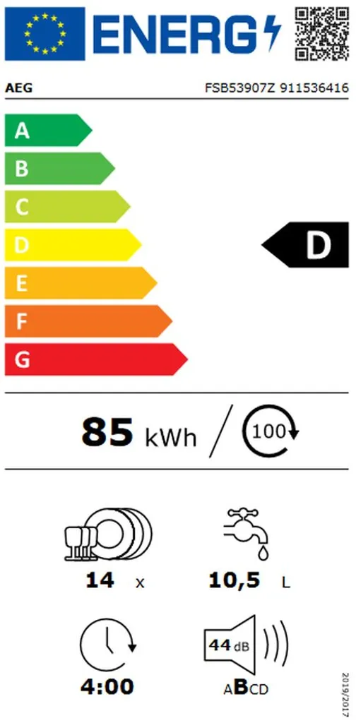 AEG FSB53907Z. Geräteplatzierung: Voll integriert, Produktgröße: Standardgröße (60 cm), Bedienfeld Farbe: Schwarz. Anzahl Maßgedecke: 14 Maßgedecke, Lärmemissionsklasse: B, Geräuschpegel: 44 dB. , Wasserverbrauch pro Zyklus: 10,5 l, Energieverbrauch pro 100 Zyklen: 85 kWh. Breite: 596 mm, Tiefe: 550 mm, Höhe: 818 mm