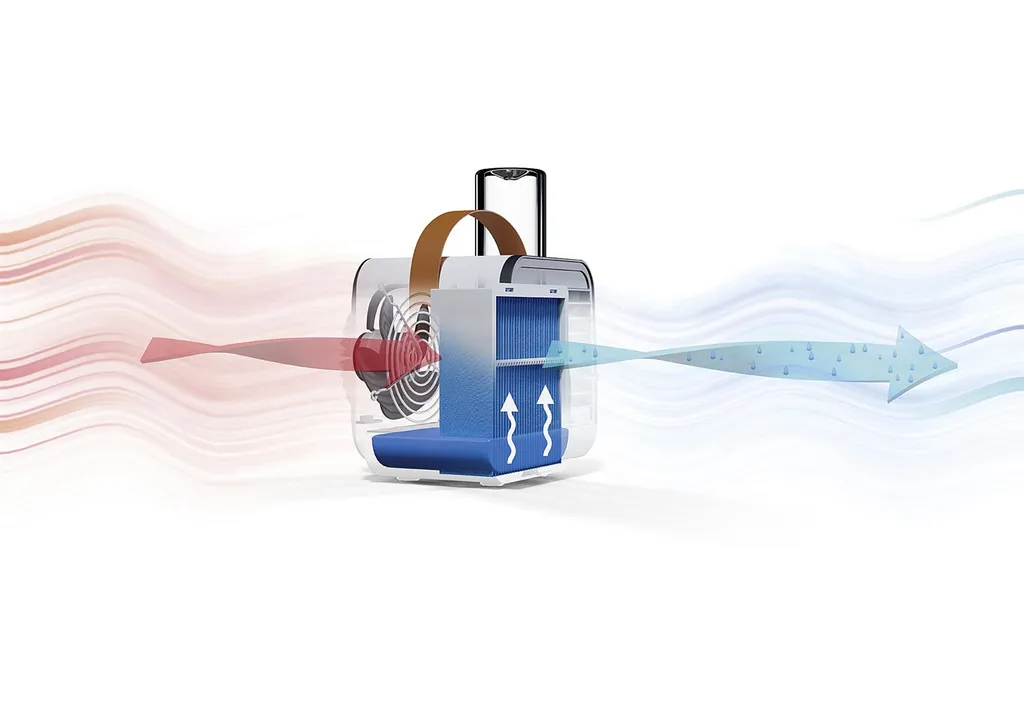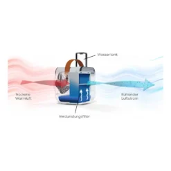 Der Luftventilator saugt die trockene Warmluft des Raumes an, welche auf den mit Wasser vollgesaugten Verdunstungsfilter trifft. Durch den Kontakt zwischen Luftstrom und feuchter Filteroberfläche verdunstet das Wasser. Die Raumluft nimmt die Feuchtigkeit auf. Dabei wird der Raumluft die Wärmeenergie entzogen, die für die Verdunstung notwendig ist. Die fühlbare Temperatur der Raumluft sinkt.