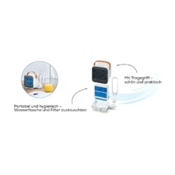 | Luftkühlung und Luftbefeuchtung durch Ventilator und Verdunstungsprinzip | Kleiner Begleiter durch den Sommer – der Tragegriff machts leicht | Wasserflasche als abnehmbarer Wassertank | Kompakt und portabel – Ideal für den Arbeitsplatz oder das Homeoffice | Kühlt bis zu 4 Stunden (Betrieb auf höchster Stufe) | Sichtbarer Wasserstand in der Flasche | Auch ohne Wasserflasche als Ventilator nutzbar | Hygienisch durch austauschbare Flasche und austauschbaren Verdunstungsfilter | Leicht zu reinigen | Zubehör im Lieferumfang enthalten: 1x 0,25 Liter Flasche, 1x Verdunstungsfilter, 1x Micro-USB-Kabel | Keine über die Produkt/Verpackungskennzeichnung hinausgehenden gesetzl. Pflichtangaben