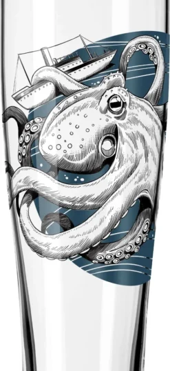 – Seemann und Krake. Das Design inszeniert mit akribisch ausgeführten Zeichnungen eine uralte Volkssage, die auf den Weizengläsern in mitreißenden Arrangements für neue Begeisterungsstürme sorgt.