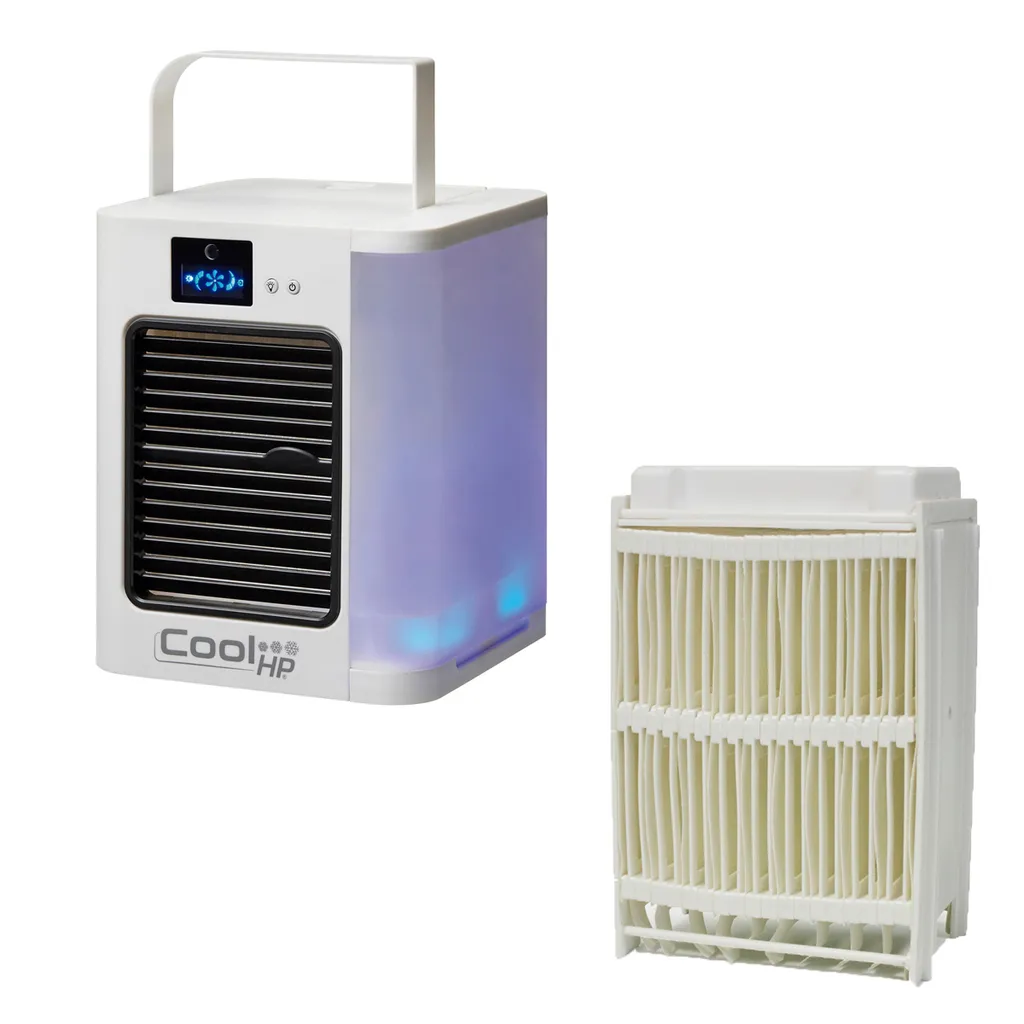 Cool HP – Der weiße Luftkühler ist durch seine kompakten Abmessungen tragbar und daher flexibel einsetzbar. Er kann sowohl über das enthaltene Netzteil oder dank eines Adapters über einen USB Anschluss betrieben werden. Somit ist er eine sehr gute Alternative an heißen Tagen. Der Luftkühler hat 3 Geschwindigkeitsstufen und einstellbare Lüftungsöffnungen, wodurch eine Anpassung der Kühlung an den jeweiligen Bedarf möglich ist. Außerdem dient er auch als Luftbefeuchter. Der 500 ml Wassertank ist für eine Funktionsdauer von 8 Stunden ausgelegt. Mit seiner Optik und dem eingebauten, blauen LED-Licht wird der Luftkühler zum modernen Begleiter auf vielen Tischen.