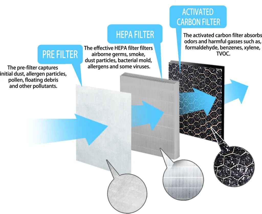 - 3-Phasen-Filter: Frontheber + HIGH EFFICIENCY HEPA-Filter + Aktivkohlefilter