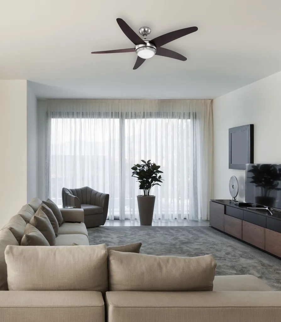 Dieser edle Deckenventilator präsentiert sich mit fünf abgerundeten Rotorblättern in Nussholzfarbe. Er ist dreistufig schaltbar und kann bis zu einer Raumgröße von 30 m2 problemlos eingesetzt werden. Sein Durchmesser beträgt 132 cm und er kann bei Dachschrägen angebracht werden, wenn eine Neigung von 30° nicht überschritten wird. Dank seines Rechts- und Linkslaufs kann man diesen Ventilator sowohl im Sommer als auch im Winter betreiben. Weiters sind die Umdrehungen 3-stufig regulierbar und können mit einer benutzerfreundlichen Fernbedienung gesteuert werden. Die maximale Motorleistung beträgt 55 W.