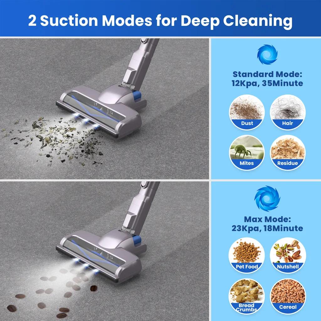 【Starke Saugsleistung】 18 Minuten bei hoher/23000pa und 35 Minuten bei niedriger/12000pa, Akku Staubsauger auf allen Arten von Hartböden, Teppichen, Treppen und Fenstern, Sofa und Bett, Schreibtisch und Vorhängen usw.