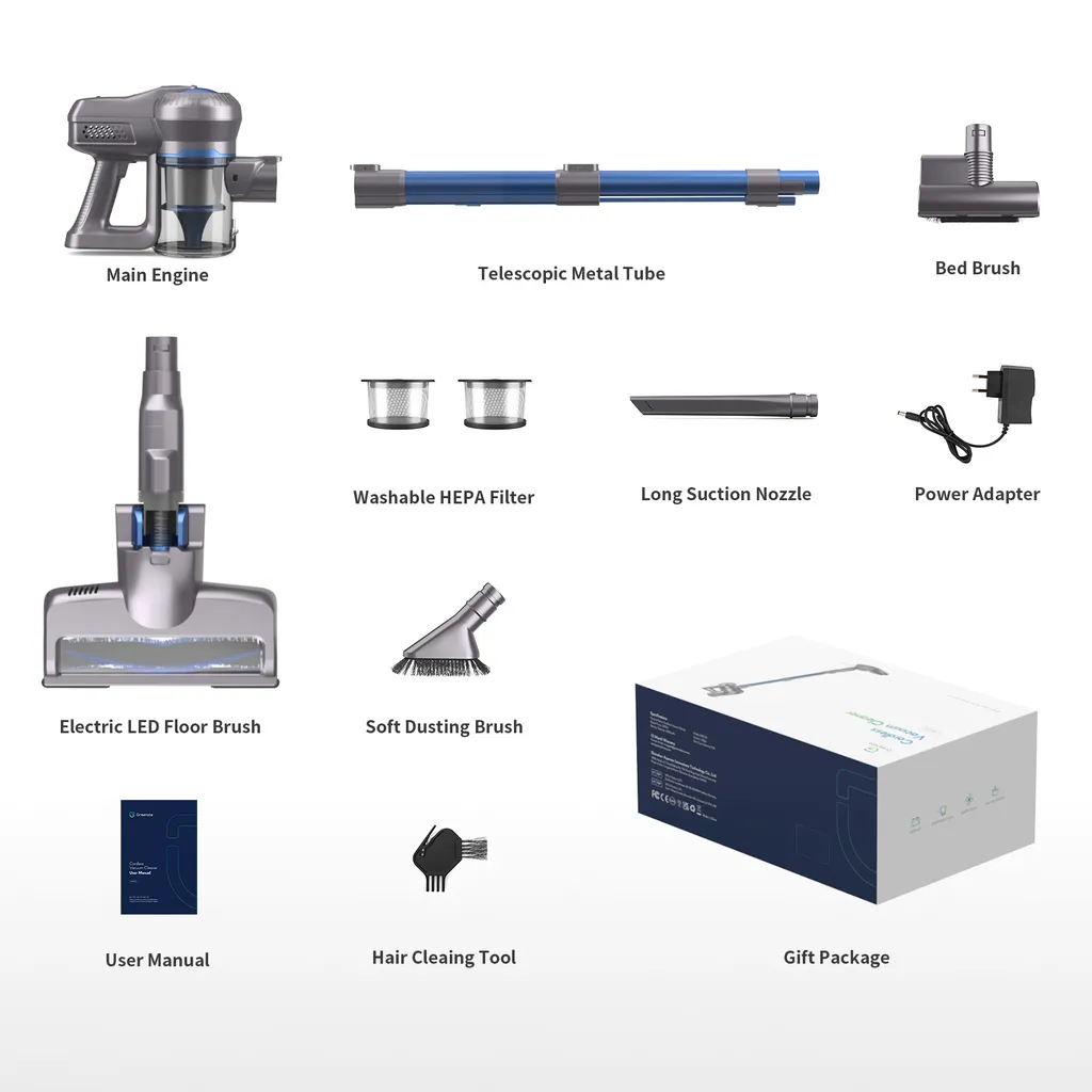Besonderheiten:23000 PA starke Saugleistung + 200 W bürstenloser Digitalmotor, 5-stufiges Filtersystem + 2 x waschbarer HEPA-Filter, Haushaltsstaubsauger GSC50, 2200 mAh x 6 langanhaltende Leistung + 35 min Laufzeit,4-in-1 multifunktionale Ersatzbürste + 3 x LED-Beleuchtung,Selbststehender Staubsauger + Teleskopschlauch