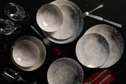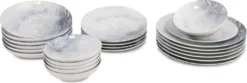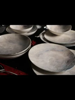 Mit diesem edlen 24-teiligen Tafelservice kannst du dein Abendessen auf stilvolle Weise servieren. Es besteht aus Speisetellern, Servierplatten und Schüsseln. Dieses Porzellanset bringt Leben in die Party und sorgt für Gesprächsstoff unter den Gästen. Das stilvolle blaue Design ist dank des kratzbeständigen und bruchsicheren Materials sehr langlebig.