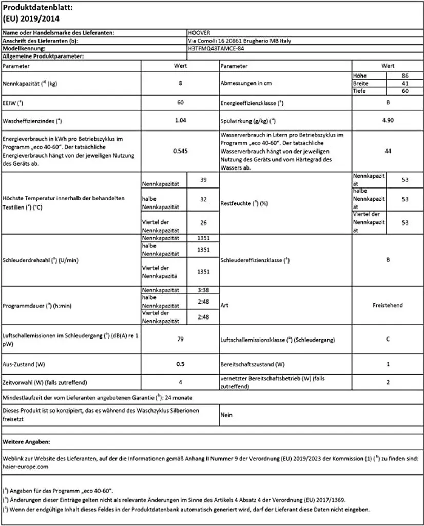 Energieverbrauch (kWh) des Standardprogramms Baumwolle 60 °C bei vollständiger Befüllung: 0,68