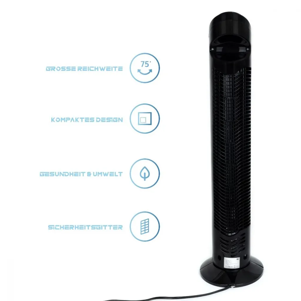Der Turmventilator hat eine Oszillationsfunktion, die ihn in einem Winkel von 65 ° von links nach rechts drehen lässt.