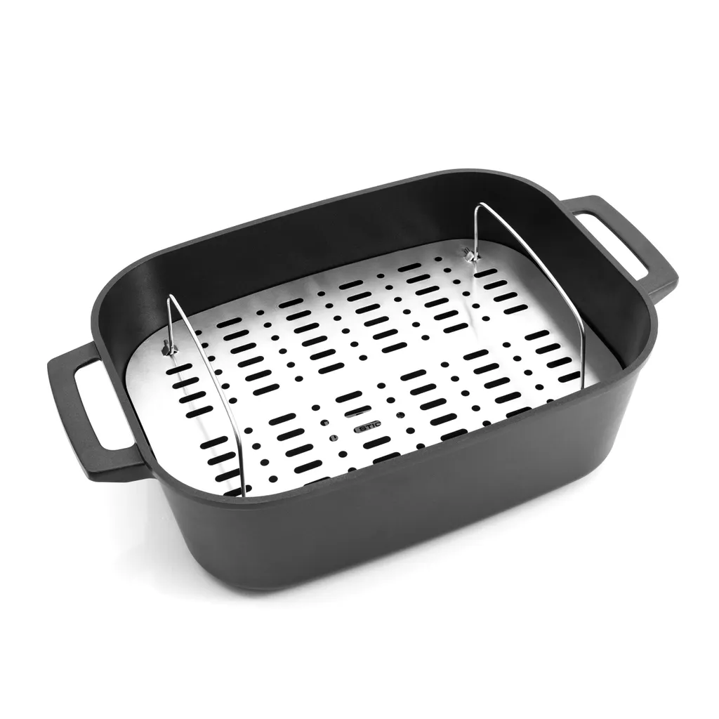 - Zusammenstellung: Zusätzlich zum Aluguss Bräter erhalten Sie einen Glasdeckel mit Aromaknopf und einen Rosteinsatz aus Edelstahl