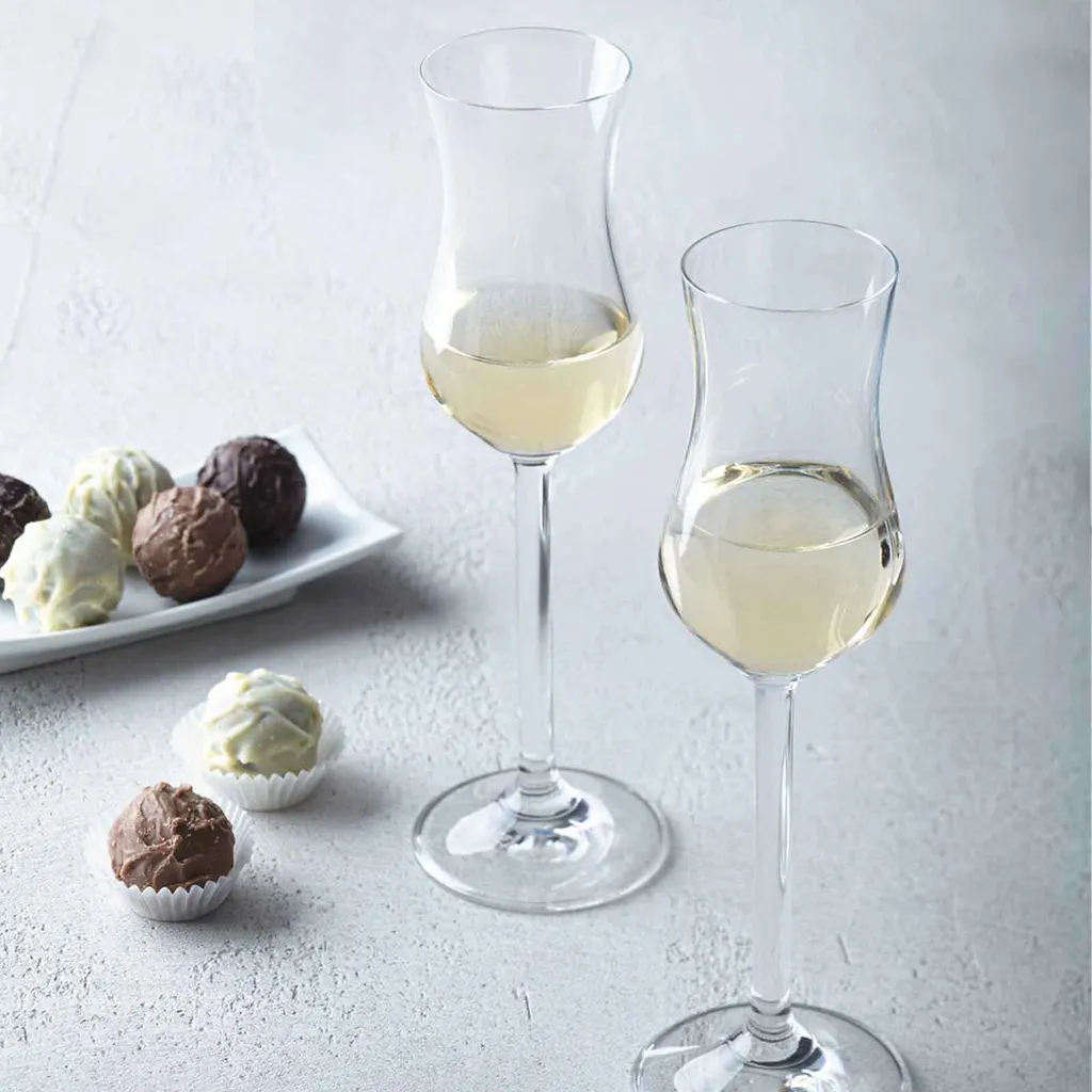 Durch die leicht bauchige Form der klangvollen Destillat-Gläser können Spirituosen, wie z. B. Grappa, Brandweine oder Schnäpse ihr Aroma wunderbar entfalten und stilvoll genossen werden.