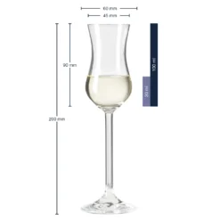 Die Digestifgläser für edle Schnäpse, Sherry und Portwein eignen sich für 30-ml Nutzinhalt (100-ml Randvollvolumen) und haben ein Maß pro Glas von 200 x 60 x 60 mm (HxBxT).