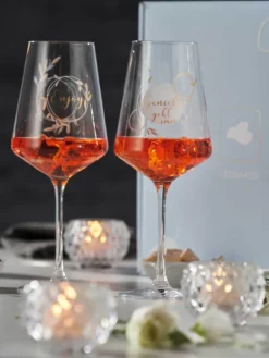 Die zwei Weingläser mit den Sprüchen Enjoy und Genießen geht immer sind in der originellen Geschenkverpackung eine großartige Geschenkidee. Diese zwei Weingläser sind optimal als Geburtstagsgeschenk für Ihre Freundin oder Freund. Geschenke, die ohne viele Worte Ihre Liebe zeigen. Der breite Boden des Kelches sorgt für eine optimale Entfaltung des Weinbouquets: Für den idealen Genuss aller Arten von Weinen und Aperitifs. Das Teqton-Glas sorgt für dauerhafte Brillanz und Transparenz und ist somit langanhaltend kristallklar. Sie sind spülmaschinengeeignet und somit besonders praktisch im Alltag. 2 Weißweingläser erhalten Sie in diesem Set. Zögern Sie nicht mehr lange – mit dem schönen Weißweinglas wird der Alltag zum Genuss! Dieser Artikel macht sich außerdem hervorragend als Geschenk!