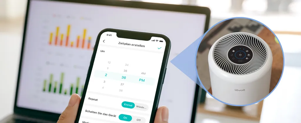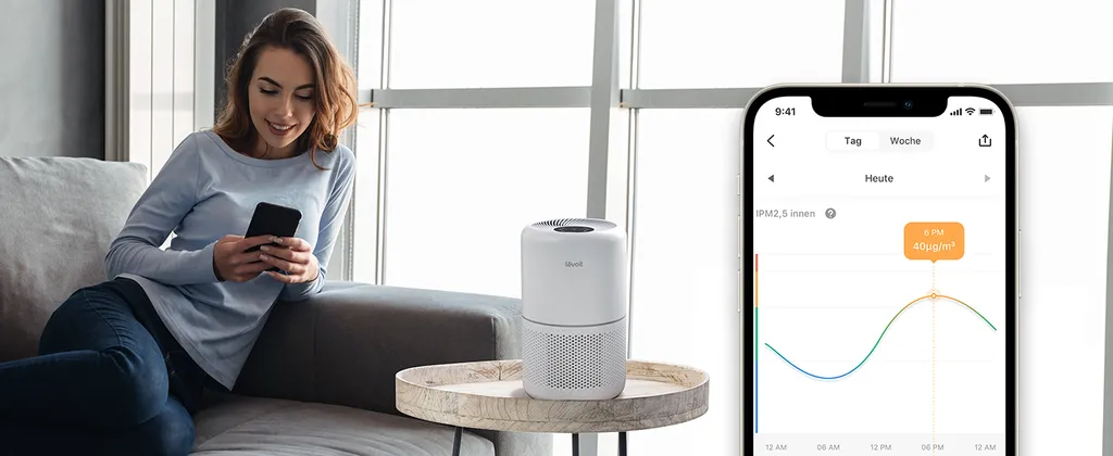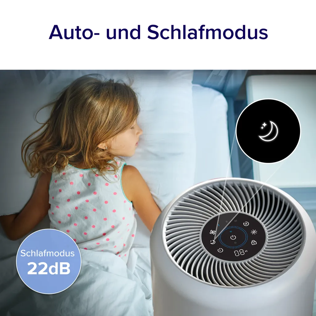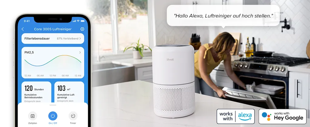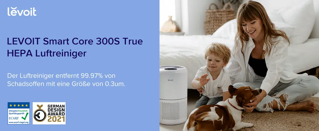 Levoit Smart Core 300SMit dem Luftreiniger Core 300S von LEVOIT erhalten Sie einen leistungsstarken Luftreiniger mit 3-stufiger Filtration und Smart Home Funktionen. Dank seines echtem HEPA-Filters mit Aktivkohle-Vorfilter fängt er Staub und Allergenpartikel wirksam auf, und absorbiert unangenehme Gerüche.Der hocheffiziente HEPA-Filter der Klasse H13 ist für die Aufnahme von Allergenen und Luftverschmutzungen bis zu 0,3 Mikron Größe wie lungenschädigender Staub, Schimmelsporen, Pflanzenpollen, Tierschuppen usw. zuständig.Leistungsstarke LuftreinigungDer Core 300S mit 360° Design und Vortexair-Technologie zeichnet sich durch eine Luftreinigungsrate von CADR 195 m³/h aus. Somit deckt er effektiv Räume von 41 m² in 30 Minuten ab. Ideal also für Wohnzimmer, Schlafzimmer, Küche, Büro usw. Besonders hervorragend geeignet ist er für Allergiker und Meschen, die unter Nasenverstopfung, Niesanfällen oder juckenden Augen leiden.Leiser BetriebDank seiner QuietKEAP-Technologie hat der Schlafmodus einen nahezu geräuschlosen Schallpegel von 22 dB und sorgt für ungestörten und angenehmen Schlaf. Er reinigt die Raumluft lautlos während Ihres Schlafes. Optimal für Schwangere, Babys, Kinder, Tierbesitzer, Raucher und Allergiker. Multi-Funktion Per Timer können Sie Betriebszeiten nach Wahl einstellen und einen individuellen Zeitplan erstellen. Nach Bedarf lässt sich der Durchsatz in 3 Gebläsestufen regeln. Zusätzlich lässt sich die Displaybeleuchtung abschalten sowie eine Displaysperre aktivieren.Smart Home FunktionenDer Core 300S ist mit WIFI ausgestattet und lässt sich bequem per VeSync-App über das Smartphone steuern. Um es noch komfortabler zu gestalten, lässt sich die VeSync-App mit Amazon Alexa und/oder Google Assistant verbinden, und im Anschluss per Sprachbefehl steuern.Effiziente 3 Stufen Filtration Das hocheffiziente Filtersystem besteht aus einem HEPA-Filter der Klasse H13, einem Aktivkohlefilter und einem feinen Vorfilter. Der Core 300S filtert effektiv bis zu 99,97 % der in der Luft befindlichen Schadstoffe wie Pollen, Staub, Tierhaare, Hautschuppen, Tabakrauch und Haushaltsgerüche.Eigenschaften: H13 HEPA & Aktivkohlefilter gegen 99,97% Luftstaub, geeignet für Allergiker und Raucher Leiser Schlafmodus mit Geräuschpegel von 22 dB Einstellbarer Timer Displaysperre Anzeigen für WIFI- und Filter-Status Smart-Funktionen über Amazon Alexa, Google Assistant und VeSync-App Lasersensor zur Überwachung der Raumluft und Regelung des Luftreinigers (Automatik Modus) 100 % ozonfrei Luftreinigungsrate (CADR): 195 m³/h Geeignet für Räume bis zu: 41 m² Geräuschpegel: 22-47 dB Filtersystem: Aktivkohlefilter, HEPA Filter & Vorfilter Gewicht: 3,7 Kg Maße: 22 x 22 x 36 cm (LxBxH) Nennleistung: 15W Stromzufuhr: AC 220-240 V, 50/60 Hz Farbe: WeißLieferumfang:1x LEVOIT Core 300S Luftreiniger 1x Dreistufiger True HEPA Original-Filter (vorinstalliert) 1x Bedienungsanleitung (DE/EN/FR/IT/ES) 1x Schnellstartanleitung