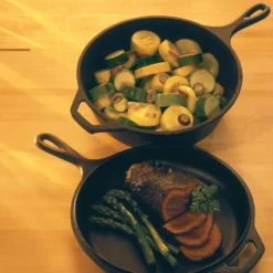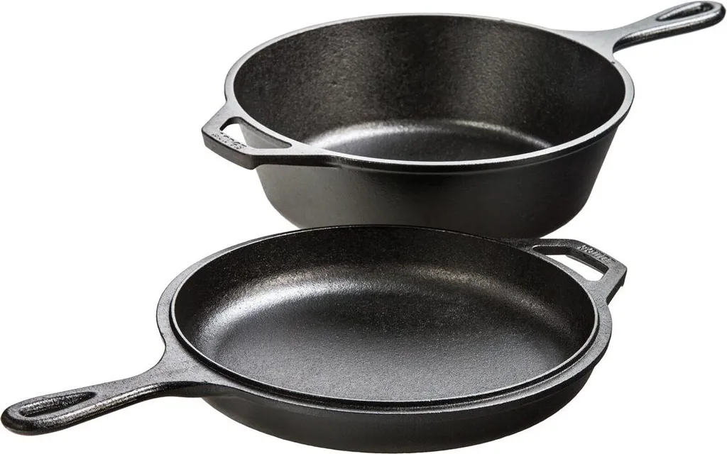 Der Lodge Combo Cooker bietet Dir viele Möglichkeiten zum Kochen oder Backen. Der Durchbesser bei Pfanne und Deckel beträgt ungefähr 27 cm, somit hast Du eine ausreichende Größe, um Dich und Deine Freunde oder Familie mit genug Nahrung zu versorgen. Die tiefe Pfanne kann zugleich als Dutch Oven benutzt werden. Ein Dutch Oven kann man sich wie einen kleinen Ofen vorstellen, man kann mit ihm braten, aber auch schmoren und backen, wenn man den Deckel draufsetzt und mit Ober- und Unterhitze arbeitet. Der Deckel kann zeitgleich auch als eine flache Pfanne oder Griddle verwendet werden. Wie Du siehst, sind Deiner Kreativität keine Grenzen gesetzt! Gusseisen hat gegenüber Edelstahl den Vorteil, dass die Wärmeverteilung wesentlich gleichmäßiger ist. Außerdem wird es viel heißer. Nur bei der Pflege sollte man vorsichtiger sein. Die Lodge Cast Iron Gusspfannen sind schon sehr gut vorher eingebrannt worden, somit reicht lediglich lauwarmes Wasser und eine Bürste aus Naturfasern, um die Pfanne zu reinigen. Nach mehrfacher Nutzung kann man mit einer Pflegepaste eine neue Patina einbrennen lassen.