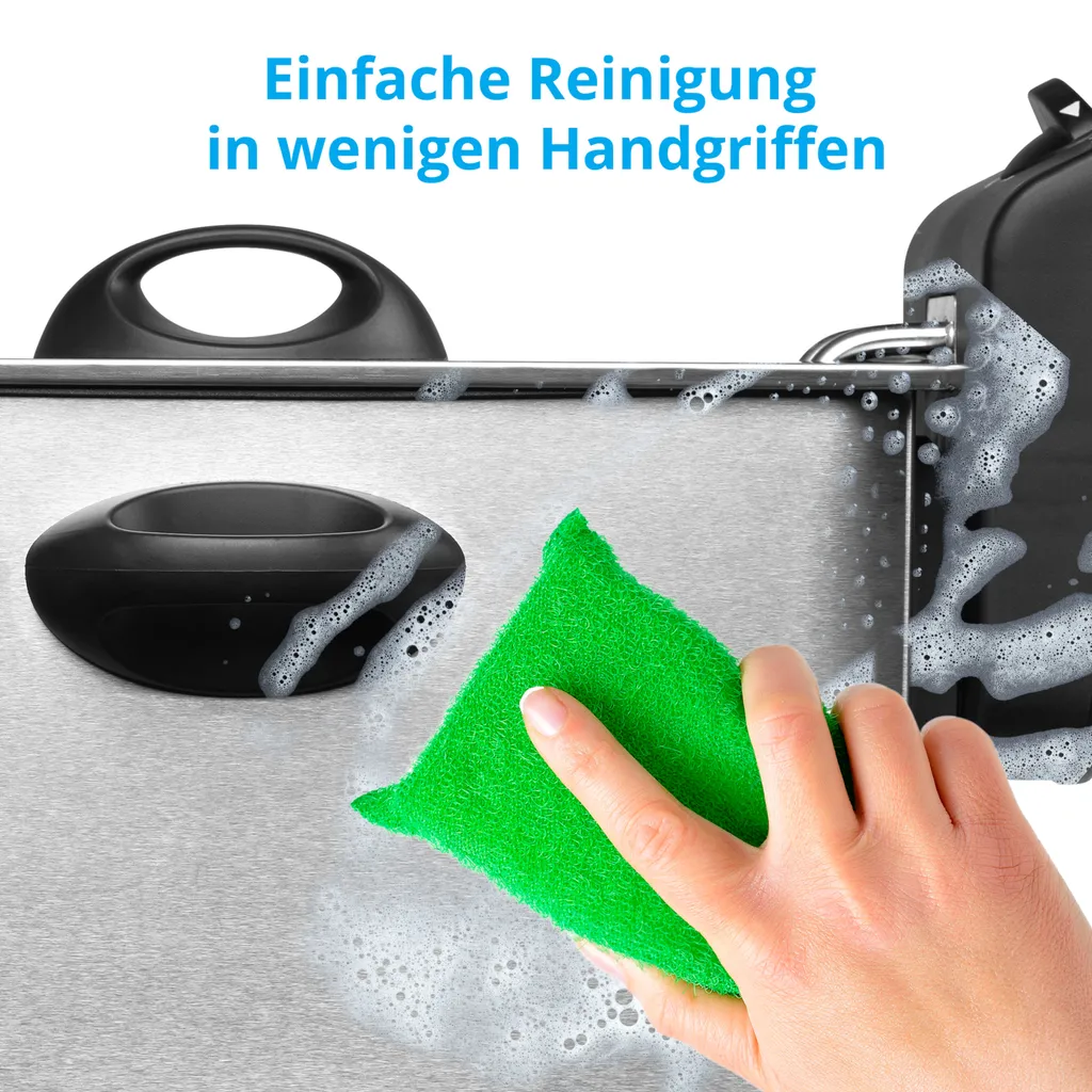 Nach der Nutzung entnehmen Sie einfach den Ölbehälter und reinigen ihn mühelos für den nächsten Einsatz. So bereiten Sie sich oder Ihren Lieben jederzeit spontan leckere Snacks zu und haben hinterher trotzdem noch genug Zeit für ein gemütliches Beisammensein.