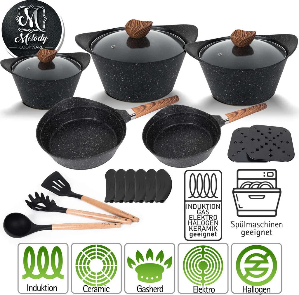 - Das Topfset umfasst drei Töpfe, drei Glasdeckel, zwei Pfannen, einen Pfannenwender, eine Suppenkelle, einen Spagettilöffel, sechs abnehmbare Silikonhülsen und zwei Bakelite-Matten.
