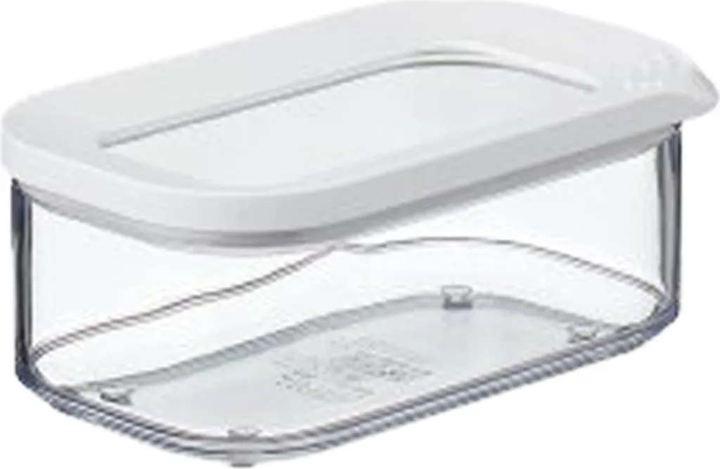 Vorratsdose Modula 425 ml, mit einem durchsichtigen Deckel mit weißem Ring. Diese kleine rechteckige Dose mit abgerundeten Ecken hat ein Inhalts-Volumen von 425 ml und ermöglicht einen direkten Blick auf den Inhalt. Der transparente Deckel mit weißem Rand und Dichtungsring sorgt für einen perfekten Verschluss, wodurch diese Vorratsdose ideal geeignet ist für die Aufbewahrung von trockenen Lebensmitteln wie z.B. Rosinen, Nüsse oder Süßigkeiten. Die Modula Vorrats- und Aufbewahrungsdosen sind in verschiedenen Größen und Ausführungen erhältlich, liegen gut in der Hand und sind leicht zu öffnen. Desweiteren sind die Dosen stapelbar und spülmaschinenfest.