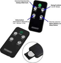 - 3 Modi einstellbar: Normal – Natürlich (simulierte Seebriese mit inkonstantem Luftstrom) – Schlafmodus (leiser Betrieb)