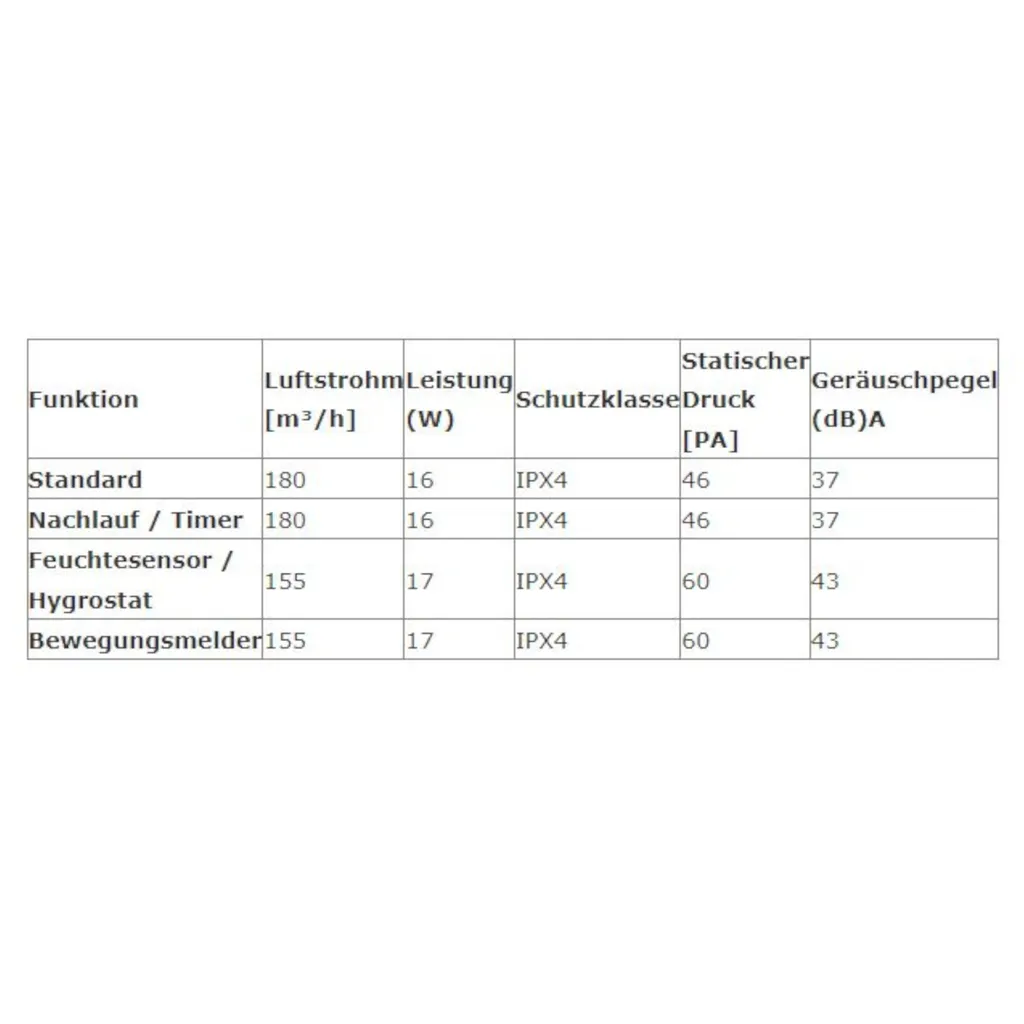 Folgende Funktion ist gleichzeitig inbegriffen: sobald die Raumfeuchte (je nach Einstellung 40-80%) erreicht ist, schaltet sich der Ventilator automatisch ein. Nach Ablauf der Nachlaufzeit schaltet dieser selbstständig wieder aus.
