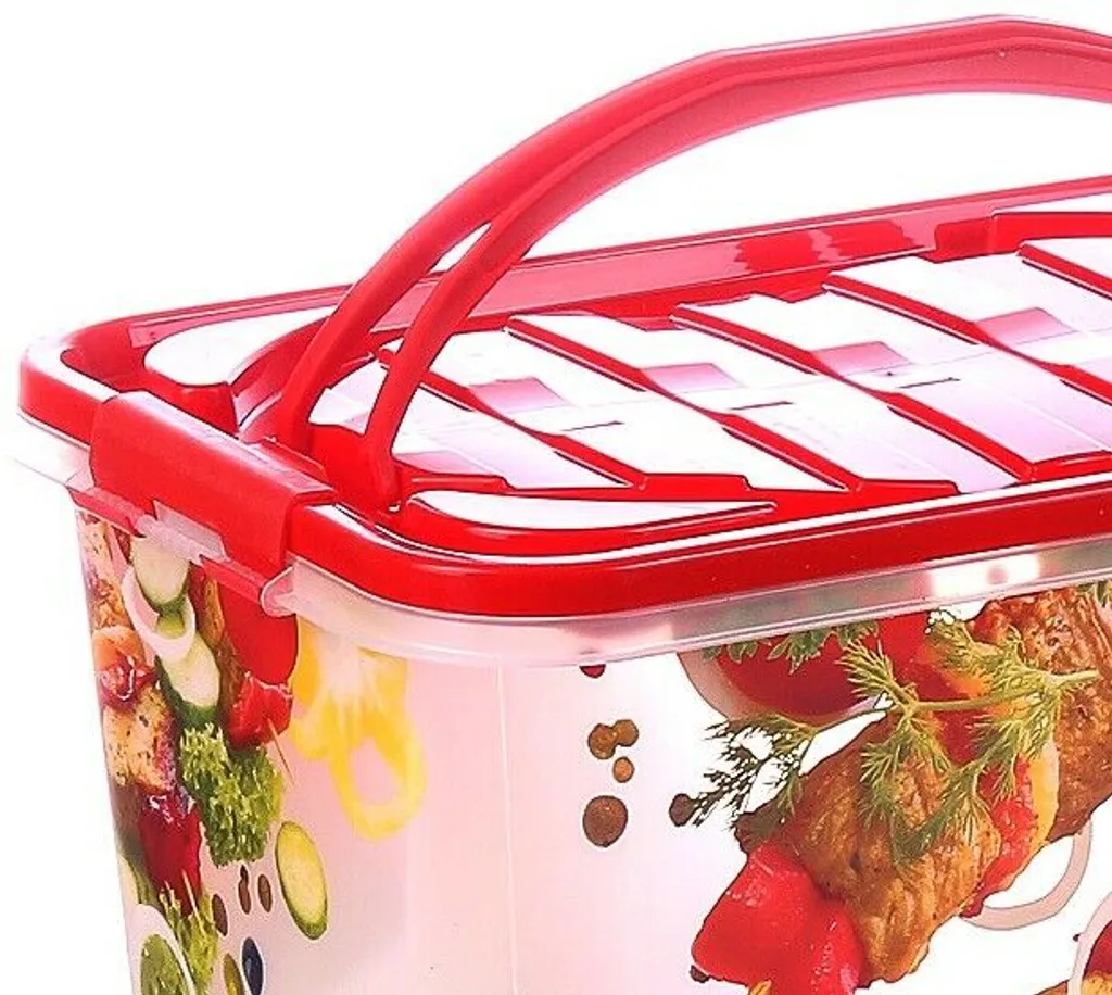 Bunte Aufbewahrungsbox mit Griffen, Deckel und Klippverschluss.