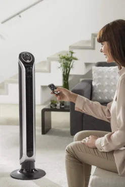 3 Geschwindigkeitsstufen, Oszillation bis 180°, Luftstromvariator, Fernbedienung mit Aufbewahrungsfach, digitale Kontrollanzeige (LED) , leises und leistungsstarkes Tangentialgebläse, Abschaltautomatik nach 1, 2, 4 oder 8 Std., Höhe: 100 cm