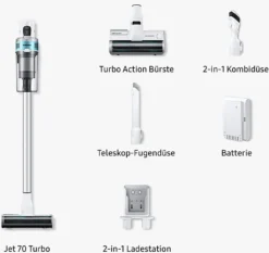 Der kabellose JET 70 Turbo Handstaubsauger von Samsung, reinigt dank des effizienten Digital Inverter Motors und der optimalen Luftstromführung schnell und gründlich Ihre Fußböden.
