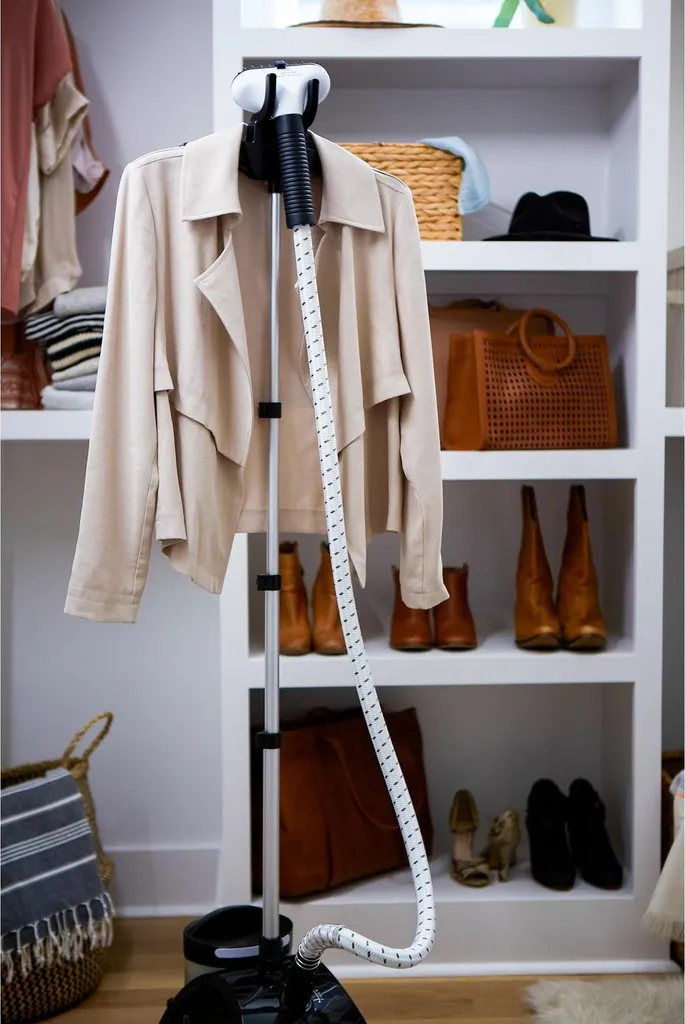 Mit 90 Minuten kontinuierlichem Dampf, der sich in 45 Sekunden aufheizt, werden Falten schnell beseitigt. Der Dampfgarer verfügt außerdem über einen um 360 Grad drehbaren Aufhänger und eine Teleskopstange für eine einfachere Verwendung und Aufbewahrung.