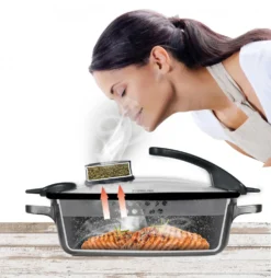 Der patentierte Glasdeckel ist mit der einzigartigen Smell Well-Kartusche ausgestattet. Diese Kartusche bietet wahlweise eine Geruchsfilter- oder Aroma-Funktion. Der Geruchsfilter-Einsatz filtert Essensgerüche, sodass kein unangenehmer Raumduft zum Beispiel bei der Zubereitung von Fischgerichten entsteht. Die Aroma-Funktion kann mit Kräutern, Fruchtschalen o. ä. anstelle des Kohlefilters genutzt werden, um während dem Kochen einen angenehmen Duft in Ihrer Küche zu verbreiten.