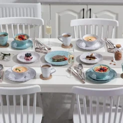 - Nature Farben Elemente. Das Essgeschirrservice Set enhält zwei Naturfarben – Beige und Blaugrün. Einfach zu erinnern an die Natur Elemente wie Meer und Sand, was Ihnen eine stilvollen Eleganz und bequeme Erfahrung verleiht. Die einzigartige blaue Farbanstimmung errinnen sich einfach an blauen Ozean, wunderschöne Muschel und angenehmen weißen Sand!
